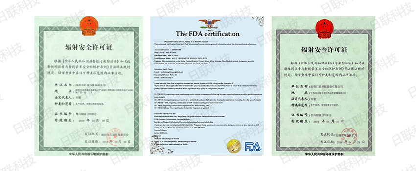 日聯(lián)科技各類設(shè)備都嚴(yán)格申請了蘇環(huán)輻射安全許可證、美國FDA安全認(rèn)證、有些還具有豁免證書。