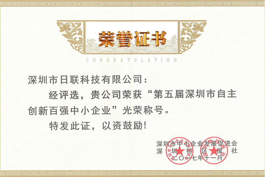 2017年11月23日下午,由深圳市科創(chuàng)委、深圳市中小企業(yè)服務(wù)署、中國(guó)中小企業(yè)協(xié)會(huì)指導(dǎo),深圳市中小企業(yè)發(fā)展促進(jìn)會(huì)與深圳特區(qū)報(bào)社聯(lián)合主辦的“創(chuàng)新驅(qū)動(dòng)·攜手圓夢(mèng)--第五屆深圳市自主創(chuàng)新百?gòu)?qiáng)中小企業(yè)暨十*中小企業(yè)創(chuàng)業(yè)英才頒獎(jiǎng)盛典”在五洲賓館盛大舉行,日聯(lián)科技等百家企業(yè)獲得了該榮譽(yù),深圳市委市政府相關(guān)領(lǐng)導(dǎo),企業(yè)代表、及社會(huì)各界代表出席了本次盛典。